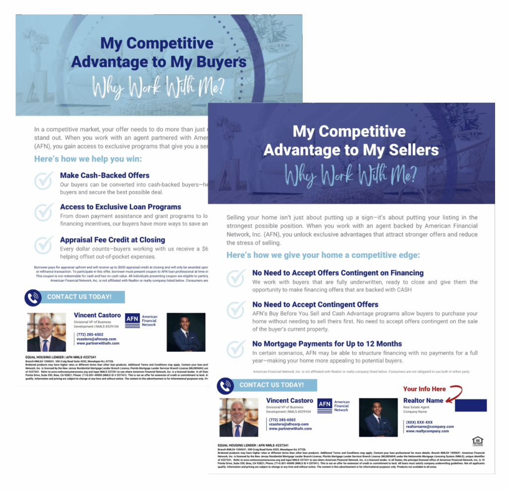 AFN provides co-branded marketing materials that make it easy to promote yourself and your listings with confidence. From a personalized phone app with real-time updates to automated co-branded marketing materials, you’ll have the tools to stay top-of-mind with clients.